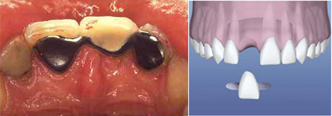 A bridge allows the dentist to replace lost teeth without the use of a denture or dental implant. Basically a false tooth is held in place by being attached to a tooth next door. The disadvantage is that the teeth next to the space have to be prepared in a similar way to a crown in order to accept the bridge. If these teeth already have crowns or big restorations then this is not a problem, the major concern however is when these teeth have small or no restorations (fillings). One compromise is the 'acid etched bridge', with this type a fine ledge is placed on the back of the adjacent teeth